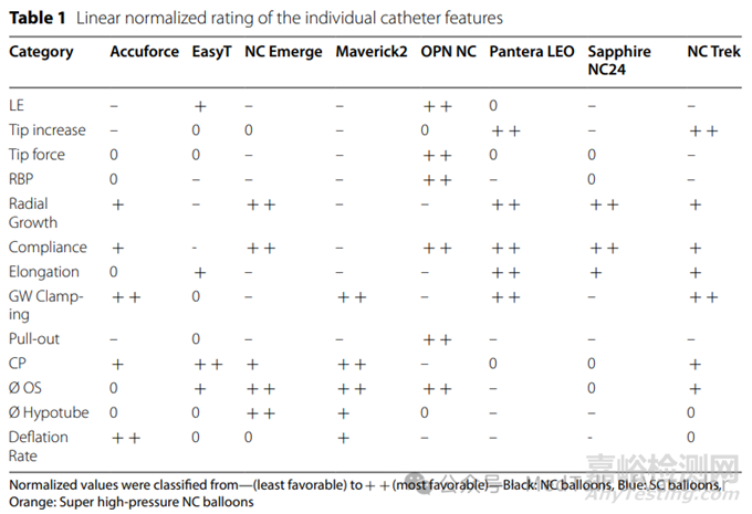表 1 展示了測(cè)量結(jié)果的概述,測(cè)量值從“-”(最不理想)到 “ + + ”(最理想)進(jìn)行分類。這個(gè)概述展示了所研究導(dǎo)管設(shè)計(jì)元素之間的優(yōu)缺點(diǎn)。需要注意的是,在歸一化過(guò)程中包括了所有測(cè)試的導(dǎo)管類型(SC 和 NC)。盡管 SC 和 NC 球囊導(dǎo)管是不同類型,通常不可比,但這樣可以展示這些數(shù)據(jù)組之間的差異。
