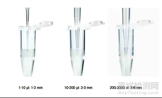 正確的吸頭浸入深度可以提高準確性高達5%,尤其對微量移液器相當重要。對于微量移液器,吸頭應該浸入(1-2)mm,而對于大量程的移液器,浸入深度應為(6-10)mm。