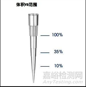 所以獲得最佳性能的最優(yōu)量程范圍是指示量程的35-100%。盡量避免將一個移液器的體積設定少于最大體積的10%,而應該用小量程的移液器來進行小體積移液操作。