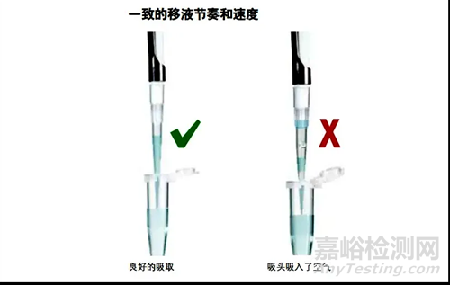 如果吸頭浸入的太深,吸頭內部的空氣就會被壓縮,造成過多的液體被吸入。殘留在吸頭表面的液體也可能會影響結果。