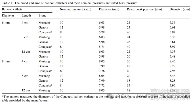 寬松圓柱體的直徑確定為略大于球囊導(dǎo)管在額定爆破壓力下的直徑:對(duì)于 6 毫米的球囊導(dǎo)管,圓柱體直徑為 6.7 毫米;對(duì)于 8 毫米的球囊導(dǎo)管,圓柱體直徑為 8.5 毫米(表 1)。當(dāng)球囊充盈至額定爆破壓力時(shí),除測(cè)量尖端外,球囊表面不與寬松圓柱體的內(nèi)表面接觸。除圓柱體直徑外,實(shí)驗(yàn)設(shè)置與實(shí)驗(yàn) 1 相同。