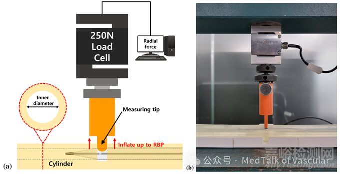 球囊的管狀段鄰近遠(yuǎn)端和近端錐形段的遠(yuǎn)端和近端,以及球囊管狀段的中間部分,分別位于測(cè)量尖端處。我們將球囊導(dǎo)管固定在圓柱體內(nèi),以防止充盈過程中的軸向移動(dòng)。我們使用帶有旋轉(zhuǎn)手柄和壓力表的球囊充盈裝置(Genoss 公司的 B40),并裝入生理鹽水來充盈球囊導(dǎo)管。通過手動(dòng)旋轉(zhuǎn)手柄并在壓力表的監(jiān)測(cè)下緩慢增加壓力,直至達(dá)到研究設(shè)備的額定爆破壓力。此后,稱重傳感器測(cè)量徑向力。所有測(cè)量均重復(fù)三次,結(jié)果采用中位數(shù)。
