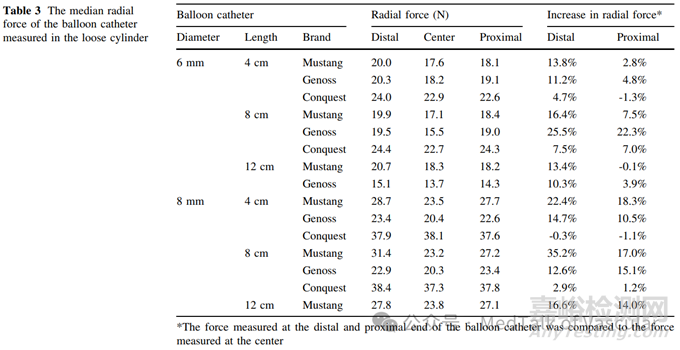 表 2 展示了球囊導(dǎo)管在緊密圓柱體內(nèi)時(shí)遠(yuǎn)端、中心和近端的徑向力,表 3 展示了在寬松圓柱體內(nèi)的徑向力。對(duì)于不同直徑、長(zhǎng)度的球囊導(dǎo)管以及不同尺寸的圓柱體,Mustang球囊導(dǎo)管遠(yuǎn)端相對(duì)于中心的徑向力中位數(shù)增加了 16.5%(范圍:9.8 - 35.2%),Genoss 球囊導(dǎo)管增加了 12.4%(范圍:10.3 - 25.5%),Conquest 球囊導(dǎo)管增加了 7.4%(范圍: - 0.3 - 13.1%)。
