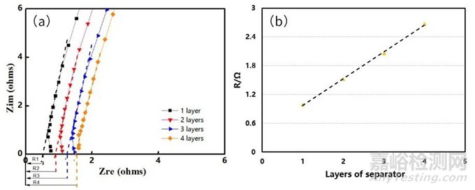 圖3.不同隔膜層數(shù)的EIS阻抗譜(a);R值擬合圖(b)