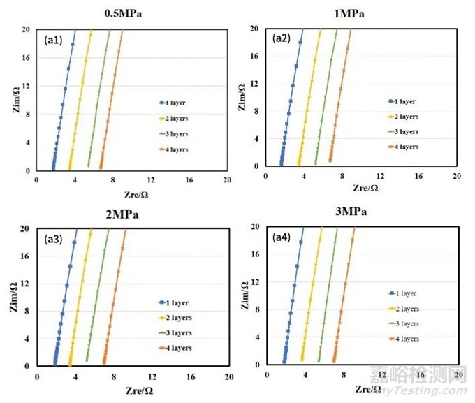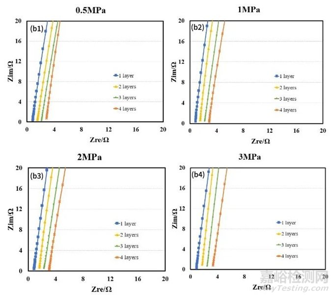 圖4. 不同壓力下隔膜的EIS圖譜:隔膜A (a); 隔膜B (b)