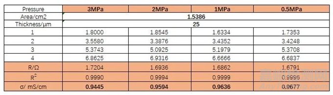 表1.隔膜A在不同壓力下的離子電阻值和離子電導(dǎo)率值