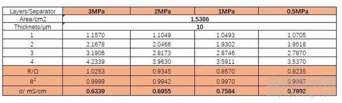 表2.隔膜B在不同壓力下的離子電阻值和離子電導(dǎo)率值