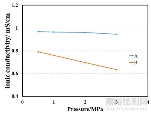 有數(shù)據(jù)表明在0~20 MPa隔膜形變?yōu)?0.5,在 20~30 MPa 隔膜形變從 0.5 增加至 0.55。在0~12 MPa,隔膜的離子電導(dǎo)率隨著應(yīng)力的增加逐漸降低,二者呈線性關(guān)系。在高于 12 MPa 時(shí), 隔膜離子電導(dǎo)率迅速下降,并逐漸趨向穩(wěn)定[4]。不同的隔膜的離子電導(dǎo)率隨著壓力的增加,其衰減各有不同,本文通過(guò)測(cè)試兩種隔膜在0-3MPa下的離子電導(dǎo)率變化,來(lái)探索壓力對(duì)隔膜離子電導(dǎo)率的影響。