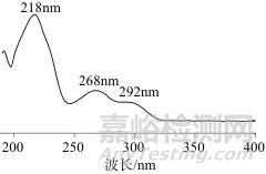 選擇光譜掃描模式,在波長(zhǎng)為190~400 nm條件下,對(duì)利血平溶液進(jìn)行全掃描。利血平樣品溶液在不同波長(zhǎng)下的光譜圖如圖1所示,從圖1中可以看出,溶液在218、268、292 nm處均有強(qiáng)吸收。由于292 nm處是肩峰,溶劑在低波段218 nm處有紫外吸收,易對(duì)檢測(cè)結(jié)果產(chǎn)生影響,且在該波段基線噪聲和漂移相對(duì)較大,雜質(zhì)峰較多,因此218 nm和292 nm均不適合作為分析條件[12]。波長(zhǎng)為268 nm時(shí)峰形平緩,干擾相對(duì)較少,因此選擇檢測(cè)波長(zhǎng)為268 nm。