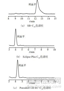 設(shè)置波長(zhǎng)為268 nm,考察SB-C18(250 mm×4.6 mm,5 μm)、Eclipse Plus C18(150 mm×4.6 mm,5 μm)、Poroshell 120 EC-C18(150 mm×4.6 mm,4 μm)3種不同類型的色譜柱的分離效果,分離色譜圖如圖2所示。從圖2中可以看出,由于SB-C18的色譜柱較長(zhǎng),利血平的出峰時(shí)間較長(zhǎng)(12.33 min),同時(shí)相比較其他兩個(gè)色譜柱,色譜峰面積也較小,峰形較差,有拖尾。Eclipse Plus C18和Poroshell 120 EC-C18 2種色譜柱的出峰時(shí)間和峰面積相差不大,Eclipse Plus C18的出峰時(shí)間稍短,面積稍大,且峰形相對(duì)于Poroshell 120 EC-C18較好,因此最終選擇色譜柱為Eclipse Plus C18色譜柱。