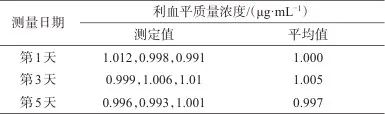 在1.2儀器工作條件下,在不同的時(shí)間內(nèi)測(cè)定相同濃度的異丙醇-水溶液中利血平。每個(gè)樣品測(cè)量3次,取平均值為最終測(cè)量結(jié)果,測(cè)量時(shí)間為5天,每隔兩天測(cè)量一次,穩(wěn)定性試驗(yàn)結(jié)果見表2。由表2可知,在不同的時(shí)間內(nèi)測(cè)量結(jié)果未發(fā)生明顯變化,表明該方法的穩(wěn)定性良好。