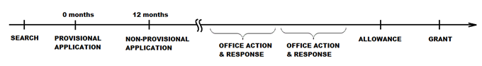 典型的專利申請(qǐng)時(shí)間線如圖所示。在提交專利申請(qǐng)之前,應(yīng)由公司或?qū)@蓭熯M(jìn)行相關(guān)技術(shù)領(lǐng)域的檢索。以美國(guó)專利申請(qǐng)為例,圖示展示了在時(shí)間為0個(gè)月時(shí)提交美國(guó)臨時(shí)申請(qǐng),該申請(qǐng)應(yīng)反映檢索的結(jié)果。不遲于12個(gè)月后,提交非臨時(shí)申請(qǐng)。之后,美國(guó)專利局會(huì)進(jìn)行自己的檢索和審查,并在一個(gè)稱為“辦公室行動(dòng)”的文件中提供反饋。為了推進(jìn)審查進(jìn)程,申請(qǐng)人需要以書面回復(fù)回應(yīng)每一個(gè)“辦公室行動(dòng)”。例子說(shuō)明了兩個(gè)這樣的周期,隨后是批準(zhǔn)通知然后授予。此過(guò)程的典型持續(xù)時(shí)間為幾年。