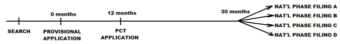 下圖展示了一個(gè)國(guó)際申請(qǐng)時(shí)間線。在這里,申請(qǐng)人在提交美國(guó)臨時(shí)申請(qǐng)之日起不超過(guò)12個(gè)月內(nèi)根據(jù)《專利合作條約》(PCT)提交了一份申請(qǐng)。PCT申請(qǐng)按照世界知識(shí)產(chǎn)權(quán)組織的規(guī)則處理,接著例子中的申請(qǐng)人向多個(gè)國(guó)家(或地區(qū))提交了國(guó)家階段申請(qǐng)。每個(gè)國(guó)家階段申請(qǐng)?jiān)谵k公室行動(dòng)和響應(yīng)方面與美國(guó)類似。值得注意的是,PCT申請(qǐng)本身不會(huì)導(dǎo)致PCT專利或國(guó)際專利的產(chǎn)生。