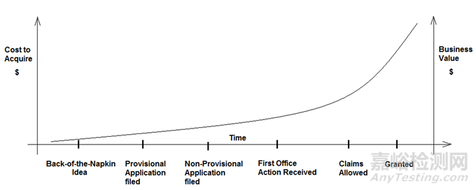 初創(chuàng)型醫(yī)療器械企業(yè)的投資者會(huì)對(duì)審查公司持有的任何專利感興趣。投資者通常使用知識(shí)產(chǎn)權(quán)組合作為企業(yè)價(jià)值的代表。精明的投資者明白,一份待定的臨時(shí)申請(qǐng)比一張餐巾紙上的想法更好,但不如幾個(gè)甚至只是一個(gè)專利組成的綜合組合令人印象深刻。隨著知識(shí)產(chǎn)權(quán)組合的成熟,投資者的信心會(huì)增加。專利局對(duì)核心創(chuàng)新的認(rèn)可增強(qiáng)了投資者信心。專利還可以幫助觸發(fā)客戶的購(gòu)買決策,吸引商業(yè)伙伴,并吸引合格的員工。投資組合成熟度與成本(或價(jià)值)之間的關(guān)系可以通過(guò)下面顯示的圖表表示。