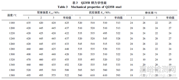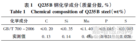 試驗用Q235B鋼化學成分實測值與國家標準對照見表1。由表1可見,試驗用Q235B鋼的化學成分符合GB/T 700—2006《碳素結(jié)構(gòu)鋼》的要求。