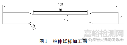 將熱處理后的試樣( 每個加熱溫度下3個) 加工成拉伸試樣( 見圖1) 。加工后的試樣在萬能試驗機上進行力學性能檢測,分析強度、伸長率與加熱溫度的關(guān)系;拉伸試驗后,選取典型斷口,采用熱場發(fā)射掃描電子顯微鏡進行分析,確定斷口形態(tài)與加熱溫度的關(guān)系。
