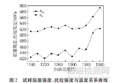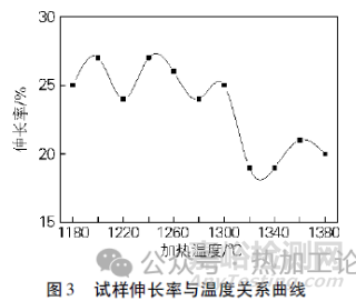 拉伸試驗力學性能見表3。強度、伸長率與加熱溫度的關(guān)系曲線,分別見圖2和圖3。