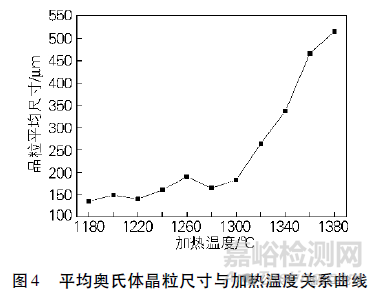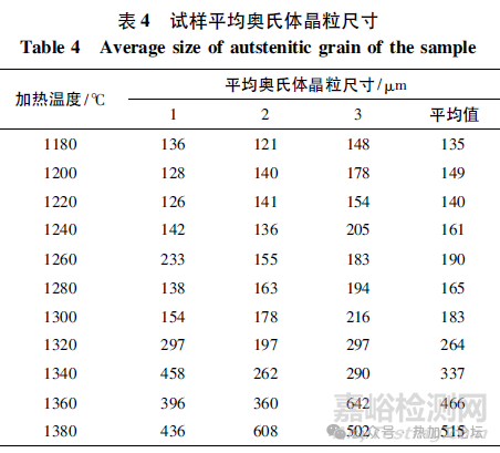 金相試樣用4%硝酸酒精溶液腐蝕后,測得各個溫度下的平均奧氏體晶粒尺寸見表4。平均奧氏體晶粒尺寸與加熱溫度關(guān)系曲線見圖4。