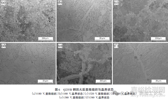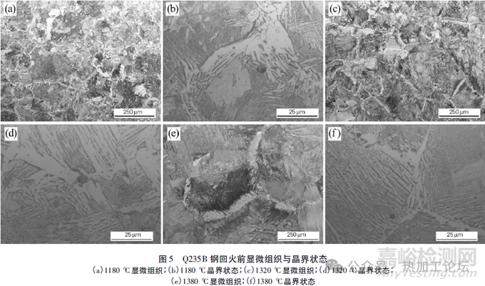 對顯微組織和力學性能結(jié)果進行綜合分析可知,Q235鋼的強度、伸長率和奧氏體晶粒尺寸均在1320℃時發(fā)生突變,且加熱至1380℃時也未發(fā)現(xiàn)晶界熔化現(xiàn)象,說明在1320~1380℃范圍試樣只發(fā)生過熱沒有過燒。1320℃為Q235B 鋼的過熱起始溫度。