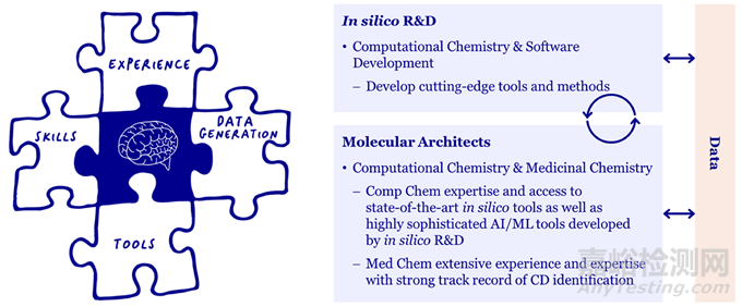 AI設(shè)計(jì)工具的出現(xiàn),加上基于物理的方法的日益影響和HPC成本的降低,促使一些制藥公司探索不同的工作方式。在Evotec,我們有一個(gè)AI/ML研發(fā)小組(計(jì)算機(jī)研發(fā)或isRD),負(fù)責(zé)將尖端技術(shù)調(diào)整和集成到我們的技術(shù)堆棧中,還有一個(gè)運(yùn)營小組(分子架構(gòu)師或MAs),他們將這些技術(shù)應(yīng)用于與化學(xué)團(tuán)隊(duì)合作的發(fā)現(xiàn)項(xiàng)目和我們的合作伙伴。MA的概念(如圖1所示)是融合藥物和計(jì)算化學(xué)的經(jīng)驗(yàn)和專業(yè)知識(shí),在數(shù)據(jù)科學(xué)和計(jì)算機(jī)工具的基礎(chǔ)上工作。我們認(rèn)為它是建立信任、實(shí)現(xiàn)雄心勃勃的目標(biāo)和加快潛在候選藥物發(fā)現(xiàn)的有力推動(dòng)者。MA確保(i)使用正確的工具和方法,無論其來源如何,也無論它們是否使用AI/ML,(ii)數(shù)據(jù)干凈且易于理解,(iii)項(xiàng)目目標(biāo)明確且得到滿足,以及(iv)創(chuàng)建定制的計(jì)算管道與高效的可操作DMTA工作流程相結(jié)合,以最少的化合物數(shù)量測試給定的設(shè)計(jì)假設(shè)。