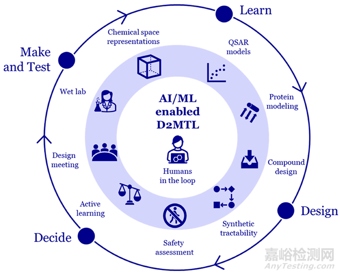 D2MTL(Design-Decide-Make-Test-Learn)的概念是由MA引入的,作為成熟的DMTA循環(huán)的演變。“Decide”的加入強(qiáng)調(diào)了選擇階段與主動(dòng)學(xué)習(xí)相結(jié)合的重要性,此時(shí)優(yōu)先考慮由人類和機(jī)器組合生成的分子設(shè)計(jì)。我們建議在工作流程中建立高效的Decide階段是實(shí)現(xiàn)卓越分子設(shè)計(jì)和確保項(xiàng)目順利進(jìn)行的關(guān)鍵。這種合作活動(dòng)不僅為藥物優(yōu)化過程提供了結(jié)構(gòu),還有助于我們的團(tuán)隊(duì)建立對藥物和計(jì)算化學(xué)更深入的相互理解。將“Analyze”替換為“Learn”表征藥物化學(xué)家的學(xué)習(xí)以及預(yù)測模型的評估和再訓(xùn)練。這種新的工作方式需要與快速綜合和測試進(jìn)行高度集成,以提高循環(huán)效率。圖2說明了這個(gè)概念,并顯示了本文中描述的應(yīng)用程序如何適應(yīng)。