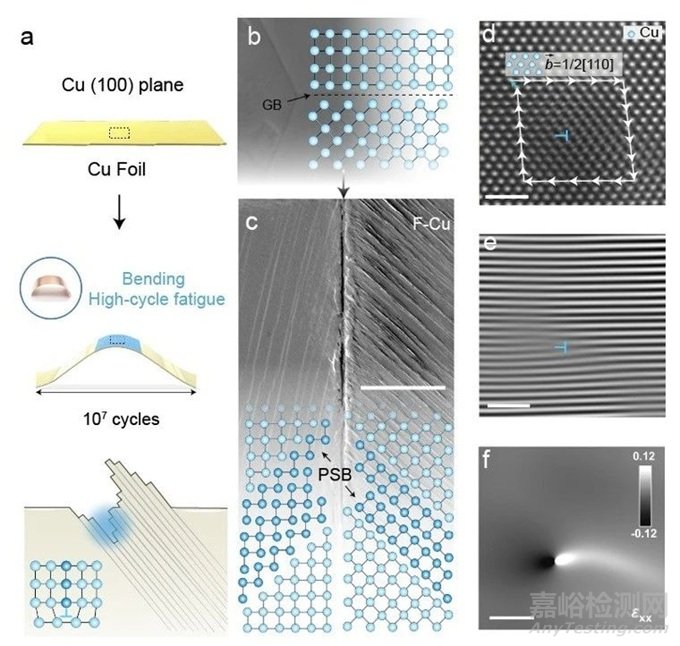 為了理解金屬疲勞的微觀起源,研究人員通過高周疲勞循環(huán)實驗,對退火的Cu(100)箔施加了1200萬次固定幅度的彎曲,根據(jù)Cu箔的幾何形狀和位移的幅度,計算得到施加了最大0.18%的應變,得到了具有高密度位錯的完全疲勞的Cu(F-Cu)。
