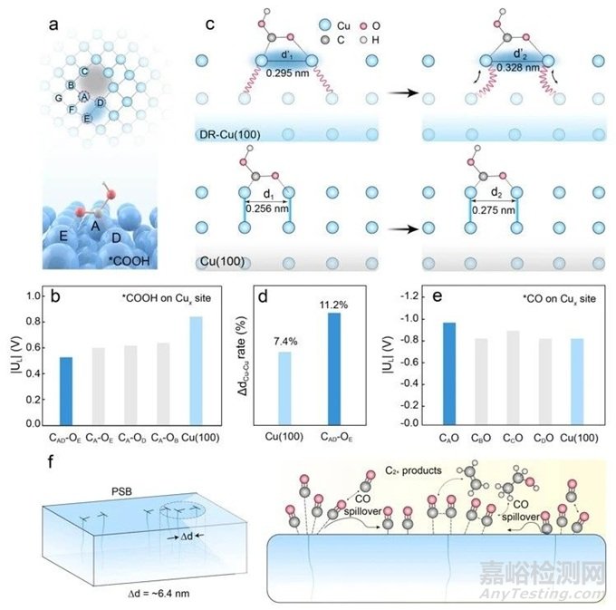 第一步中COOH的形成是在銅表面平坦位點或缺陷位點上的決速步驟。使用Cx-yOz的表示法來表示COOH基團中的C和O原子,如下圖所示,發(fā)現(xiàn)與CAD-OE結合的CuA-CuE的距離從0.295 nm顯著延長到0.328 nm,而Cu(100)表面上的Cu-Cu距離從0.256 nm拉伸到0.275 nm。CAD-OE處Cu-Cu距離變化的百分比比(100)晶面大約51.4%。位錯位點的彈簧式和自適應結構有助于各種中間體的協(xié)調(diào)穩(wěn)定,從而使催化路徑上的電位景觀更加平滑。尤其在形成CAD-OE的位點上,COOH形成的理論限制電位|UL|比Cu(100)表面低0.31 V。鑒于CO的結合能與COOH的形成能直接成比例,位錯位點因此有望導致局部CO濃度增加。同時基于2.39×1016 m-2的位錯密度,相鄰位錯核心之間的平均距離約為6.4 nm,有利于CO的溢流。增加的表面*CO覆蓋率和溢出效應在促進C2+化合物的生產(chǎn)中起著關鍵作用。