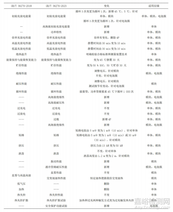 為了清晰對(duì)比新舊版標(biāo)準(zhǔn)中測(cè)試項(xiàng)目的差異,列出新舊標(biāo)準(zhǔn)的新增或刪除項(xiàng)目、具體參數(shù)變化,歸類了電池不同層級(jí)的適用范圍,并逐一進(jìn)行詳細(xì)討論與分析。