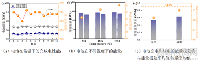 為進(jìn)一步評(píng)估新標(biāo)準(zhǔn)下現(xiàn)有儲(chǔ)能產(chǎn)品是否滿足要求,對(duì)某企業(yè)的儲(chǔ)能電池產(chǎn)品的模塊開展GB/T 36276-2023測(cè)試,重點(diǎn)關(guān)注不同溫度下的初始充放電性能、倍率性能、能量保持率、高低溫適應(yīng)性及貯存性能這幾個(gè)關(guān)鍵測(cè)試項(xiàng)目的結(jié)果。常溫、高低溫下電池的容量測(cè)試結(jié)果如圖1所示,由圖1(a)中可知該模塊的平均能量效率大于94.4%,滿足標(biāo)準(zhǔn)要求。從圖1(b)高低溫測(cè)試結(jié)果中可知電池隨溫度升高其能量密度也不斷增大,在45 ℃時(shí)表現(xiàn)最佳,這是由于溫度升高會(huì)加快電池內(nèi)部的化學(xué)反應(yīng)速率、內(nèi)阻下降及鋰離子遷移率增大,從而提高了電池的能量密度。圖1(c)充放電極差平均值不大于初始充放電能量平均值的4.5%,也符合新標(biāo)準(zhǔn)的要求。此次新標(biāo)增加了5 ℃和45 ℃的溫度測(cè)試是為了更全面的評(píng)估電池產(chǎn)品的環(huán)境適應(yīng)性、性能符合性、可靠性和效率要求,確保電池在實(shí)際應(yīng)用中的安全性和穩(wěn)定性。