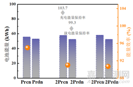 隨著新型電池材料研發(fā),原有能量保持能力評(píng)估標(biāo)準(zhǔn)可能無法準(zhǔn)確反映電池的實(shí)際情況,標(biāo)準(zhǔn)更新目的是提高電池的能量保持能力,為消費(fèi)者和制造商提供更可靠的參考。由圖3可知,該模塊充電能量恢復(fù)率為98%,大于新標(biāo)準(zhǔn)要求的95%,放電能量恢復(fù)率為99.2%,大于新標(biāo)準(zhǔn)要求的95%,該模塊的容量保持率表現(xiàn)優(yōu)異。