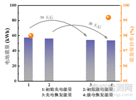 為了確保電池在長(zhǎng)時(shí)間的儲(chǔ)存過程中能夠保持良好的電性能和安全性,新標(biāo)準(zhǔn)對(duì)電池的貯存性能也提出了更高的要求。如圖5所示,該模塊在30天后的充放電能量恢復(fù)率均>95%,其中充電能量恢復(fù)率為97.1%,放電能量恢復(fù)率為98.5%,符合新標(biāo)準(zhǔn)試驗(yàn)要求。