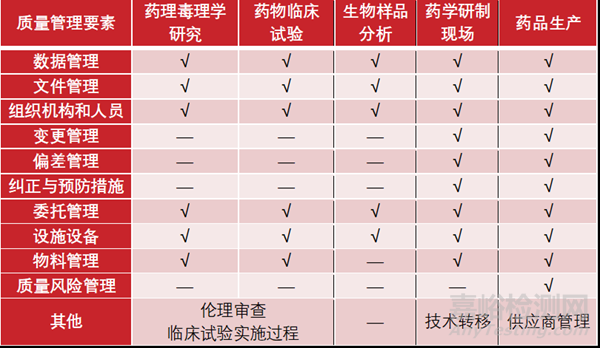 《藥品注冊核查要點及判定原則》對藥理毒理學研究、臨床試驗、藥學研制和生產現(xiàn)場制定了對應的核查要點,基于風險研判,部分研制工作可僅對記錄及數(shù)據等資料進行核查。故藥品研制從開發(fā)到商業(yè)化生產活動推進的過程中遵循越來越高標準的要求,質量管理要素和質量管理模塊上可依據風險執(zhí)行分階段分要求管控策略。