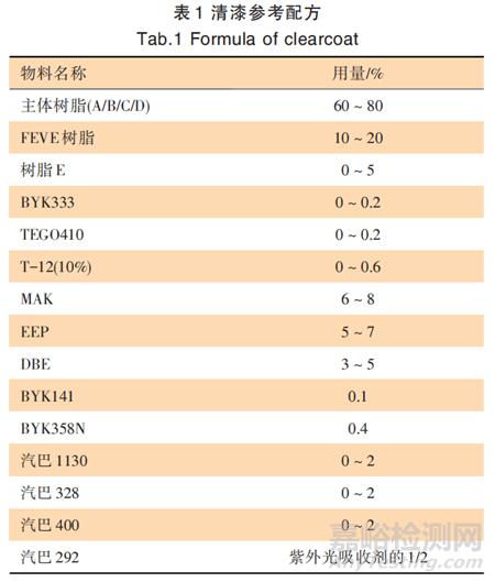 氟改性羥基丙烯酸樹脂 A:東莞市迪艾高化工有限公司;羥基丙烯酸樹脂 B:氰特;羥基丙烯酸樹脂 C:廣州本恒;羥基丙烯酸樹脂 D:清遠波特;3F 型 FEVE 氟碳樹脂:常熟市東環(huán)化工有限公司;有機硅 改性羥基丙烯酸樹脂E:廣州柯麗 ;流平劑(BYK358N)、消泡劑(BYK141)、手感流平劑 (BYK333、TEGO410):市售 ;二月桂酸二丁基錫 T- 12:濟南大暉化工科技有限公司;HT-500固化劑:萬華化學(xué);醋酸正丁酯:三木化工;甲基正戊基酮MAK、 乙氧基丙酸乙酯EEP:伊士曼;丁二酸二甲酯 DBE:東莞市聯(lián)合化工 ;紫外光 吸收劑(汽 巴 1130、328、400)、光穩(wěn)定劑(292):汽巴;底色漆:雅圖高新。