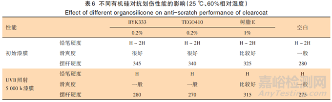 有機硅手感流平劑,加入清漆中,施工后上浮于漆膜表面,提升流平性的同時,使漆膜表面變得爽滑,從而有效提升抗劃傷性能 。有機硅改性羥基丙烯酸樹脂,與異氰酸酯反應(yīng)后分布于整個漆膜,使其具有滑爽效果和抗劃傷性能。2.5.1不同種類有機硅的抗劃傷效果為提升漆膜抗劃傷性能,在2.4基礎(chǔ)上分別添加有機硅手感流平劑BYK333、TEGO410 和有機硅改性羥基丙烯酸樹脂 E,研究其對漆膜抗劃傷性能的影響。分別對比初始的和UVB照射5000h后的漆膜滑爽度、鉛筆硬度、擺桿硬度。