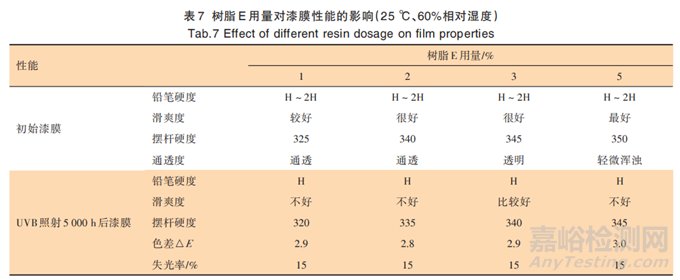 根據(jù)表6數(shù)據(jù),有機硅聚合物添加劑對鉛筆硬度無明顯影響。BYK333、TEGO410 明顯提升漆膜初始的滑爽度,從擺桿硬度可知其漆面阻尼明顯降低;但是UVB照射 5000 h 后對漆面滑爽度的提升作用幾乎 消失。1%的有機硅改性羥基丙烯酸樹脂 E 則使漆膜 長期保持較好的滑爽度,維持了良好的抗劃傷性能。2.5.2 樹脂 E 的添加量對漆膜性能的影響 作為有機硅改性的羥基丙烯酸樹脂,由于其與體 系相容性的問題,因此需要探究其用量對漆膜性能(通透度)的影響。在 1%~5%范圍研究,根據(jù)表 7 數(shù)據(jù),隨著樹脂 E 添加量增加,漆膜滑爽度提升,伴隨著漆膜變渾濁的 趨勢;由于添加量小,對耐候性無明顯影響。3%的添加量時,在保證漆膜通透度的前提下,具有長期的滑 爽度(抗劃傷性)。