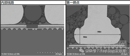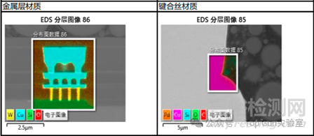 a、切片全貌SEM圖 b、seal ring位置局部SEM圖 c、內(nèi)部線路SEM圖+能譜mapping d、1焊點(diǎn)切片圖+球徑球高測(cè)量+鍵合絲能譜mapping |