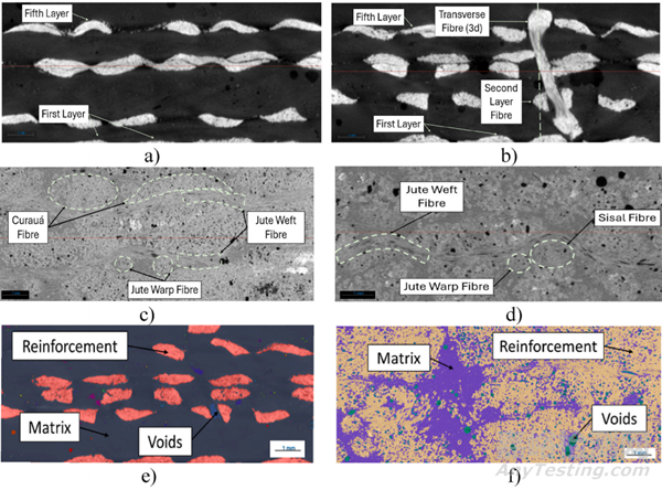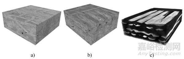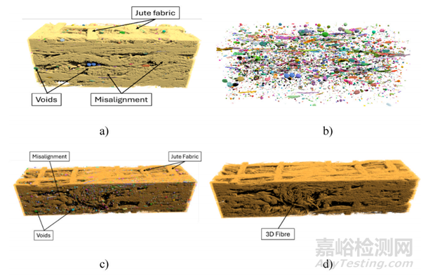 研究采用 X 射線微斷層掃描 (MicroCT) 技術(shù),對(duì)樣品內(nèi)部結(jié)構(gòu)進(jìn)行了非破壞性分析,深入探究了不同纖維類型和增強(qiáng)結(jié)構(gòu)對(duì)復(fù)合材料微觀結(jié)構(gòu)的影響。研究發(fā)現(xiàn),所有樣品均表現(xiàn)出明顯的各向異性特征,不同纖維類型的樣品在纖維壓實(shí)程度、形態(tài)和空隙率等方面存在顯著差異。此外,MicroCT 圖像清晰地揭示了樣品中纖維錯(cuò)位和空隙的分布情況,為優(yōu)化復(fù)合材料的制造工藝,提升其力學(xué)性能提供了寶貴的參考信息。