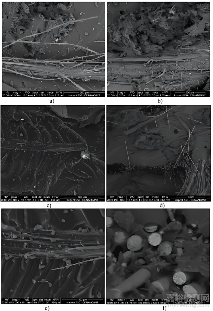 研究人員利用掃描電子顯微鏡 (SEM) 對(duì)樣品的斷裂表面進(jìn)行了細(xì)致觀察和分析,揭示了不同纖維類型和增強(qiáng)結(jié)構(gòu)對(duì)復(fù)合材料斷裂形態(tài)的影響。研究發(fā)現(xiàn),不同樣品的斷裂表面呈現(xiàn)出不同的特征,例如纖維拔出、基體斷裂和界面脫粘等現(xiàn)象。此外,SEM 圖像清晰地展示了纖維/基體界面的結(jié)合情況,以及橫向纖維在復(fù)合材料中的作用機(jī)制,為深入理解復(fù)合材料的失效機(jī)理提供了重要依據(jù)。