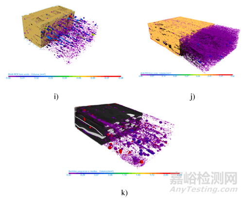 圖5 a) 2D SISAL 織物和孔隙的 3D 分割模型,b) 2D SISAL 孔隙;c) CURAUÁ 3D 織物和孔隙,d) CURAUÁ 3D 織物和 e) CURAUÁ 3D 孔隙;f) GLASS 3D 織物和孔隙,g) GLASS 3D 織物,h) GLASS 3D 孔隙和孔隙的 3D 模型統(tǒng)計(jì)分析:i) SISAL 2D、j) CURAUÁ 3D 和 k) GLASS 3D