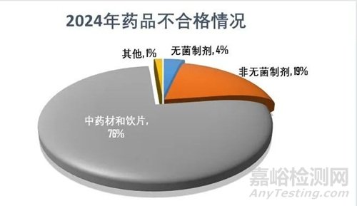 從下面的這個(gè)餅形圖中,大家可以一目了然地看出中藥材和飲片的不合格批次數(shù)量在2024年抽檢中是最多的,這也凸顯了其質(zhì)量把控方面更需要重點(diǎn)關(guān)注點(diǎn)。