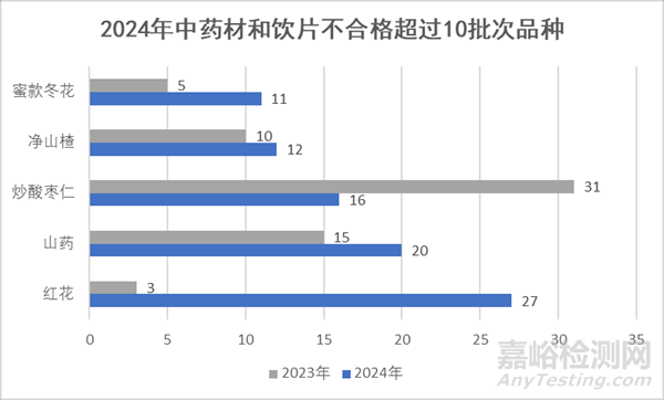 但值得注意的是,紅花在2024年不合格的批次多達(dá)27批次,穩(wěn)穩(wěn)地占據(jù)了榜首的位置,可對(duì)比2023年,它當(dāng)時(shí)僅有3批次不合格,這變化著實(shí)讓人警醒呢。
