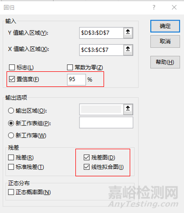 Step2-開始繪制殘差圖:點(diǎn)擊“數(shù)據(jù)分析”→“回歸”,依次輸入數(shù)據(jù)區(qū)域(X值輸入?yún)^(qū)域?yàn)闈舛葦?shù)值列、Y值輸入?yún)^(qū)域?yàn)榉迕娣e數(shù)值列,注意不要包含首行標(biāo)識(shí))、置信度默認(rèn)95%、勾選“殘差圖”和“線性擬合圖”(詳見下圖)。