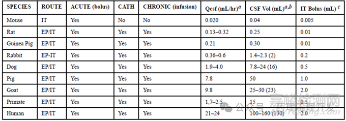 雖然小動(dòng)物模型對(duì)機(jī)制研究和一些藥理學(xué)作用研究是有用的,但大動(dòng)物更能反映與人體鞘內(nèi)體積的縮放和不同大小椎管內(nèi)的動(dòng)力學(xué)差異,及藥物局部組織暴露情況。下表羅列了不同動(dòng)物腦脊液體積和鞘內(nèi)注射體積等信息。