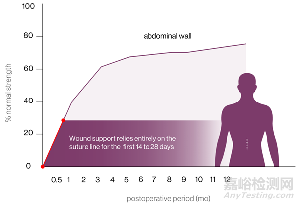 腹壁筋膜血管化程度低,導致愈合過程緩慢。在術后的前14-28天,傷口支撐完全依賴縫合線,因此這段恢復時期對于腹壁傷口的愈合至關重要。
