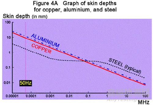 上圖:不同頻率下三種金屬的趨膚效應(yīng)深度(頻率越高,深度越淺,越趨膚);趨膚效應(yīng)以傳導(dǎo)的角度看,是希望趨膚深度深的,那表示導(dǎo)線(xiàn)的利用率高;但是對(duì)于屏蔽,是希望趨膚深度淺的,這樣就能以較薄的金屬屏蔽更多的電磁頻段;50Hz的趨膚深度5~15mm,很難屏蔽……