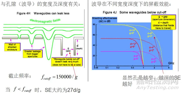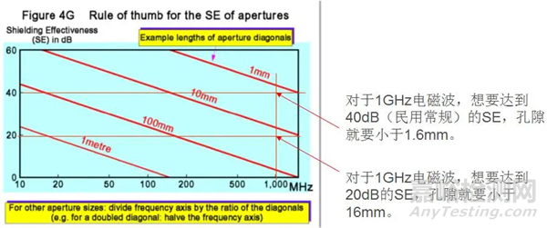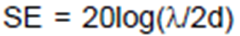 在一個(gè)完美的屏蔽殼體上開(kāi)一個(gè)洞,相當(dāng)于構(gòu)成一個(gè)半波共振縫隙天線(xiàn),屏蔽效能SE與孔的最大尺寸d、電磁波波長(zhǎng)λ關(guān)系如下: