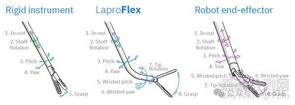 LaproFlex與傳統(tǒng)的腹腔鏡手術(shù)器械相比提供了三個額外的自由度。這些額外的自由度可以從不同的側(cè)面和角度接近目標(biāo)組織,從而增強了最終效果的可見性和定位。LaproFlex自由度與達芬奇手術(shù)機器人的多自由手術(shù)器械一樣。