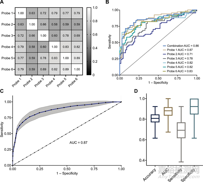 圖1 CCP探針在PDAC患者和對(duì)照組中的斯皮爾曼相關(guān)性分析,以及ROC曲線對(duì)比不同探針或組合探針在PDAC檢測(cè)中的敏感性和特異性