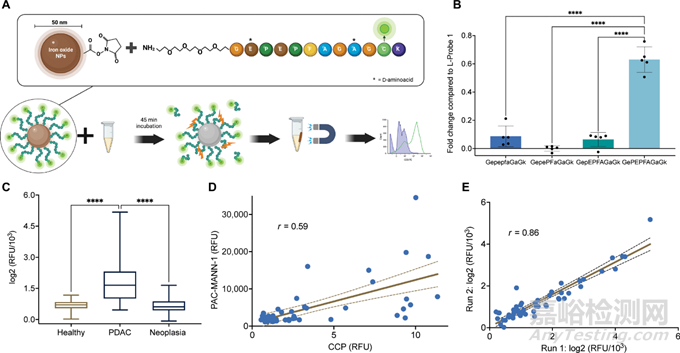 創(chuàng)新性:相較于傳統(tǒng)血清標(biāo)志物,利用蛋白酶活性檢測(cè)的放大具有更高的檢測(cè)靈敏度及特異性,能夠有效區(qū)分PDAC、胰腺良性病變和健康個(gè)體。新研究提出的克服了目前PDAC早期診斷手段不足的問(wèn)題,為高風(fēng)險(xiǎn)人群的篩查和疾病監(jiān)測(cè)提供了全新工具。