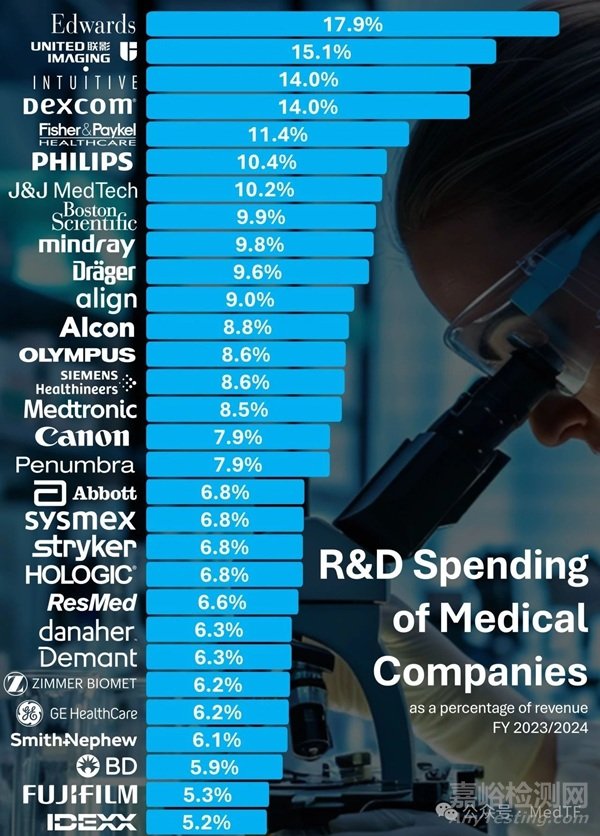 接下來(lái)是飛利浦和強(qiáng)生,作為醫(yī)療器械領(lǐng)域老牌巨頭,其研發(fā)投入都超過(guò)10%。